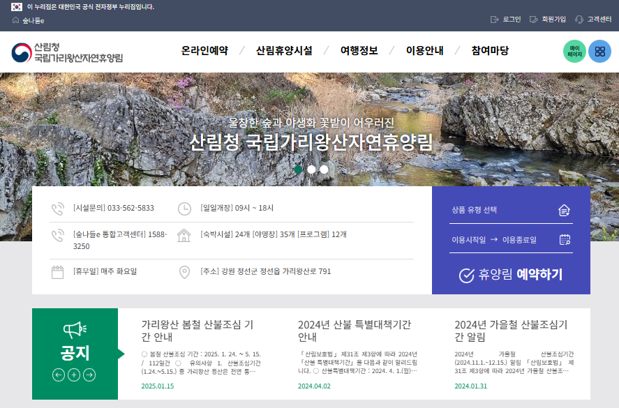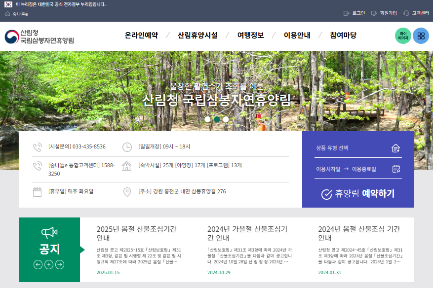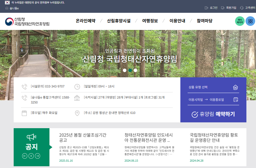 강원도 내 대부분의 자연휴양림은 산림청이 운영하는 '숲나들e'에서 통합 예약할 수 있습니다.