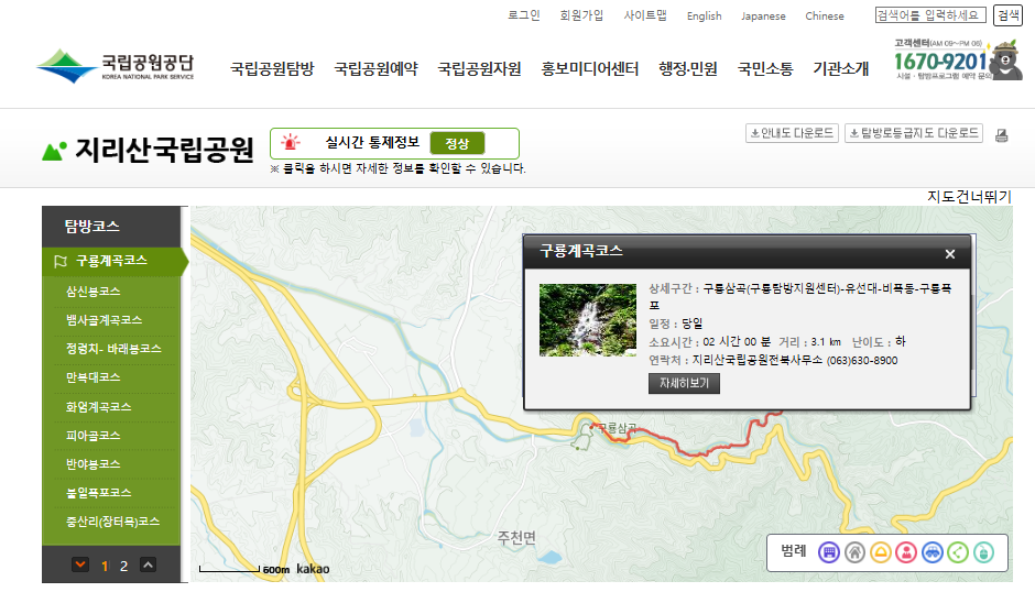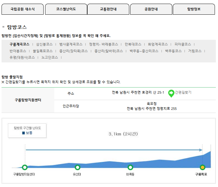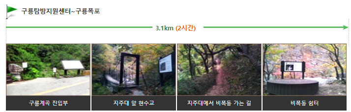 구룡계곡코스는 초보자에게 적합한 코스로, 약 3.1km의 거리를 가지고 있습니다. 소요 시간은 약 2시간 정도이며, 계곡의 아름다운 경치를 즐길 수 있습니다. 완만한 경사의 산책코스와 추락과 낙석의 위험이 있는 구간이 혼재되어 있어 항상 주위를 살피며 탐방해야 한다.