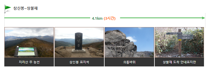청학동탐방지원센터 - 삼신봉 - 내삼신봉 - 송정굴 - 쇠통바위 - 상불재 - 삼성궁(총 : 8.3km, 약 5시간 소요)입니다. 삼신봉에 오르면 서쪽의 노고단으로부터 동쪽의 천왕봉까지 지리산의 주요 봉우리들을 한눈에 조망해 볼 수 있습니다. 삼신봉은 정상에서 북쪽으로는 세석평전, 서쪽으로는 불일폭포-쌍계사로 갈 수 있는 지리산국립공원 탐방의 요충지 역할을 하고 있습니다.