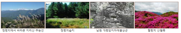 정령치는 해발 1,172m로 지리산 서북능선의 중간에 위치한 고개입니다. 차량 접근이 가능한 곳으로 천왕봉을 비롯한 주요 능선을 비교적 손쉽게 조망할 수 있습니다. 고리봉을 향하다 보면 산지습지인 정령치 습지와 보물 1,123호로 지정된 남원 개령암지마애불상군을 감상할 수 있습니다.