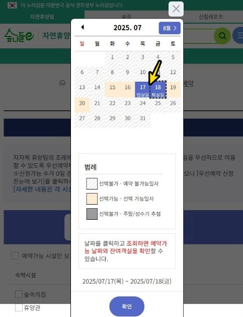 원하는 날짜와 숙박 유형을 선택한 뒤 예약 가능 여부를 확인합니다. - 예약 진행 및 결제