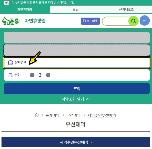 PC로 이용할 경우 숲나들e 공식 홈페이지를 통해 간편하게 수락 휴 트리하우스를 예약할 수 있습니다.